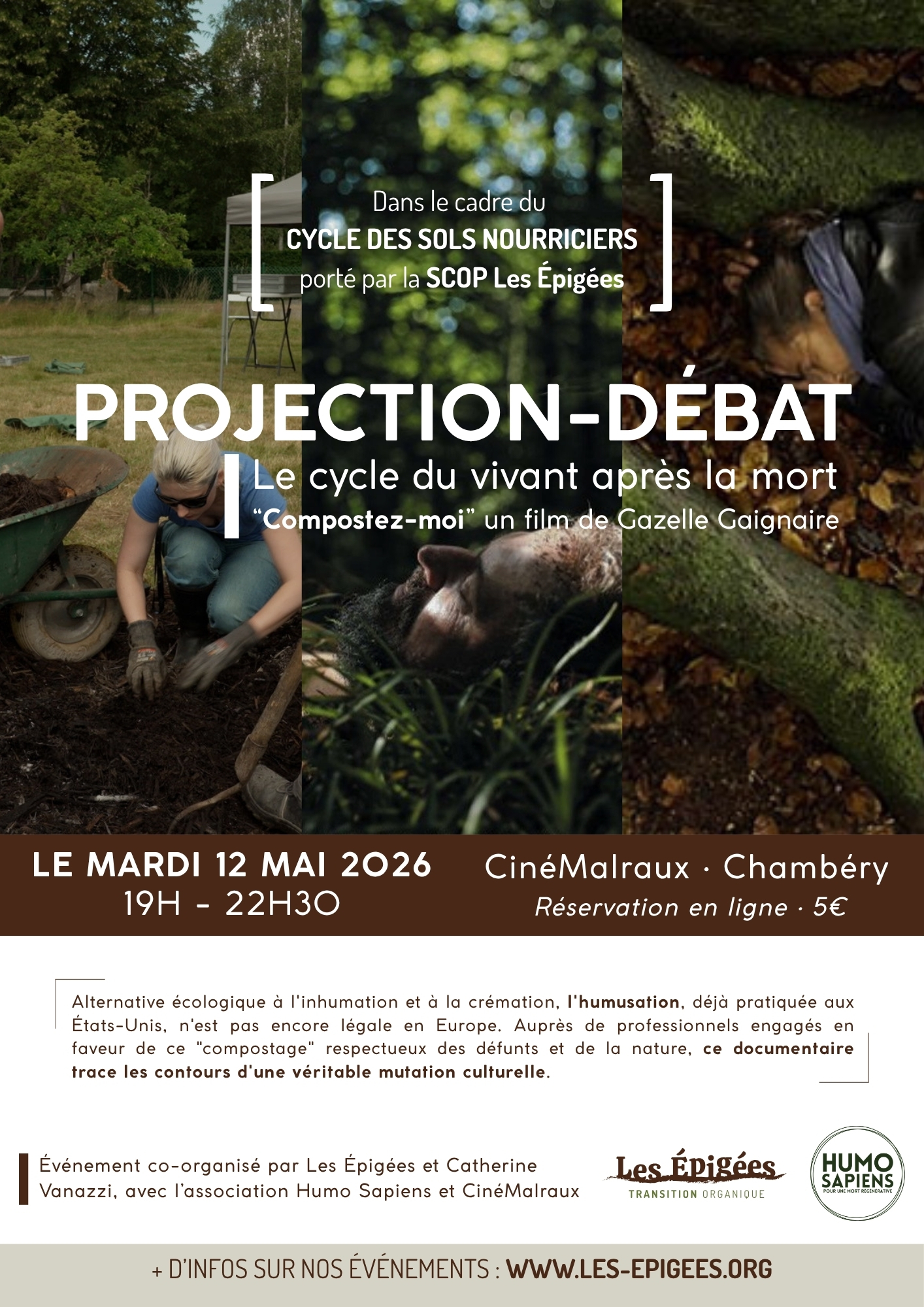 Les Épigées souhaitent soutenir cette alternative en s’associant à Humo Sapiens pour une projection-débat du film de la réalisatrice belge Gazelle Gaignaire : “Compostez-moi !” le 12 mai 2026, à 19h, au Cinéma Malraux à Chambéry.